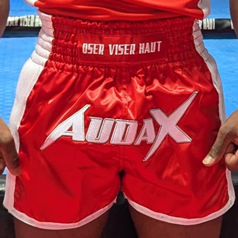 Adoptez la tradition avec nos shorts Audax arborent la coupe classique Muay Thai, courte et échancrée, pour une liberté totale lors de vos coups de genoux et de vos kicks. Conçus pour durer, ils présentent le logo Audax fièrement brodé à l'avant pour un relief et une qualité supérieure. La ceinture large et élastique assure un maintien parfait, affichant 'Oser Viser Haut' à l'avant et sa traduction 'Dare to Aim High' à l'arrière. Un rappel constant de votre ambition, que vous soyez à l'entraînement ou au combat.